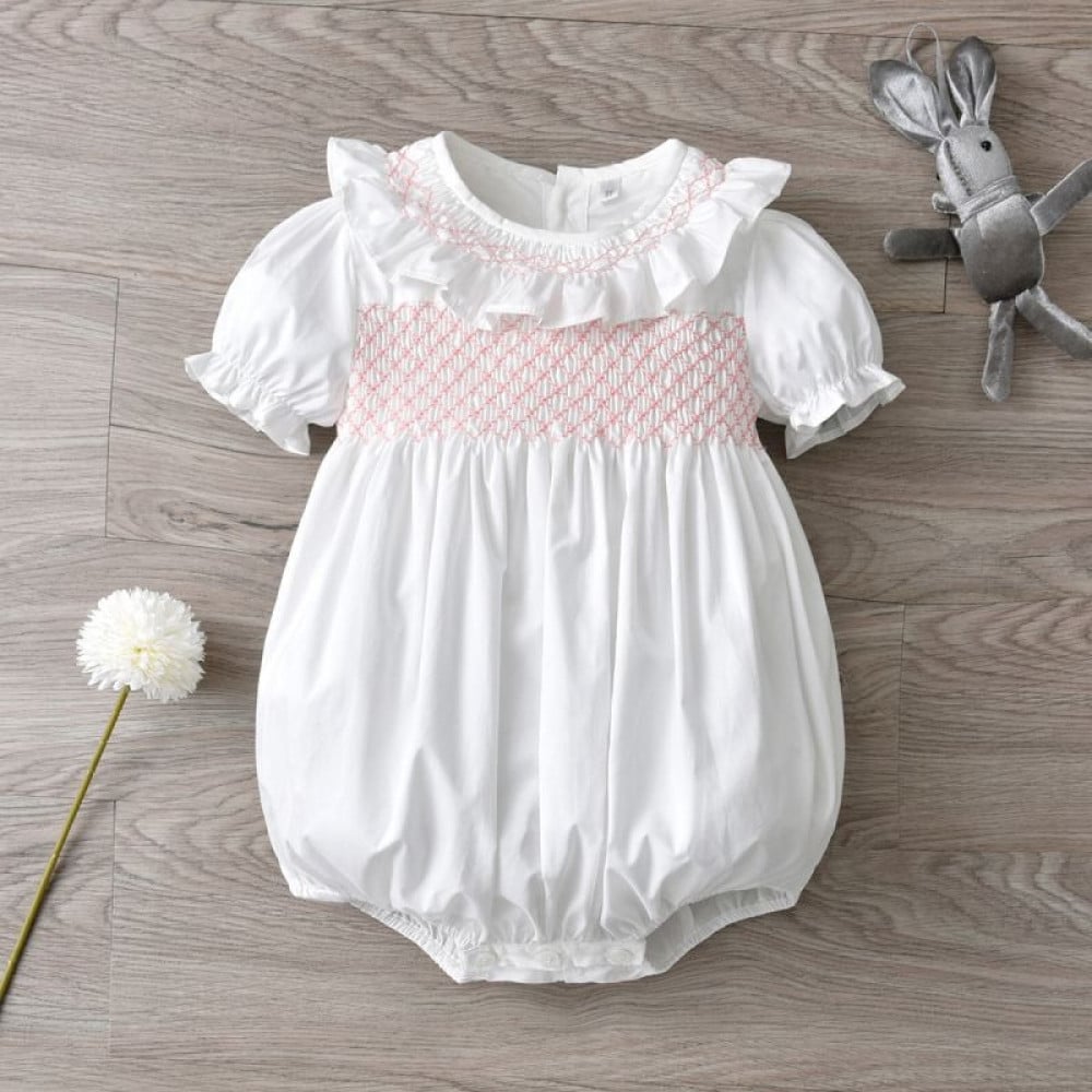 classic baby romper with pink hand embroidery